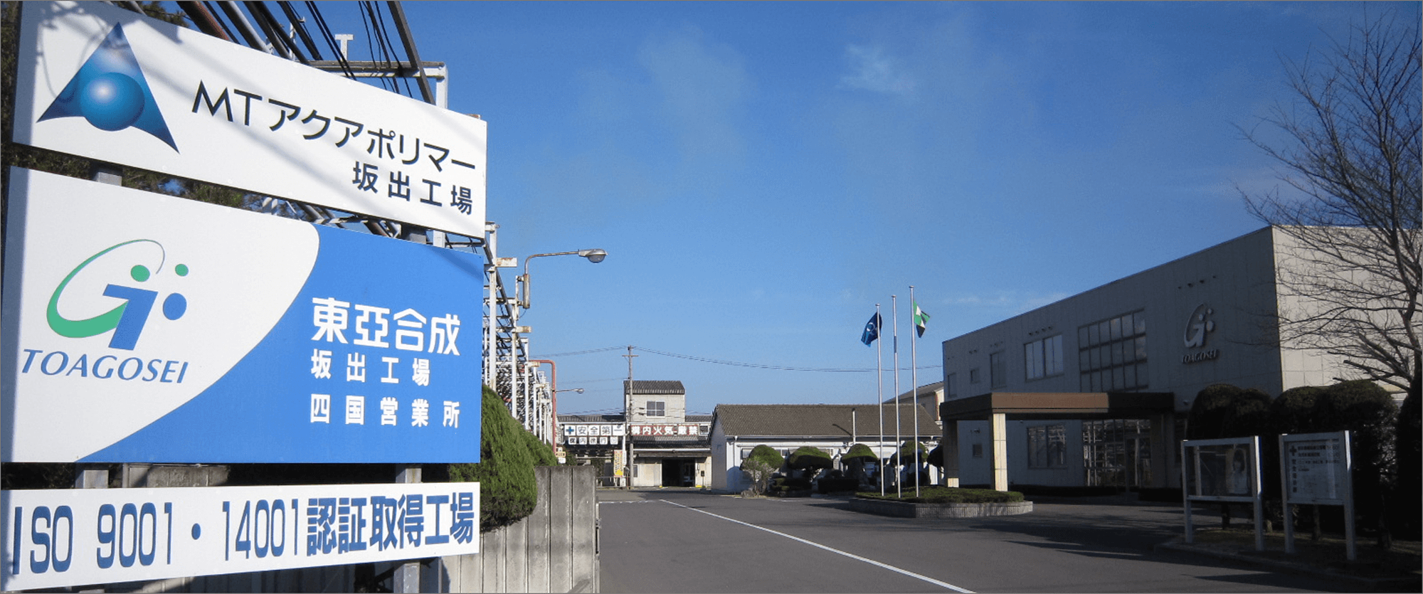 瀬戸内海に面し、四国の玄関口に位置する坂出工場は、当社グループアクリル製品事業の川下分野を担っています。主要製品の高分子凝集剤「アロンフロック」は、下水処理場や工場などの排水処理に使用され、水の安全・安心に貢献しています。