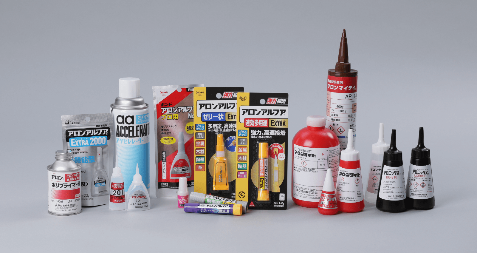 家庭用瞬間接着剤「アロンアルフア」や、ホットメルト接着剤、光硬化型接着剤、高機能反応型接着剤など、多様な工業用接着剤を製造しています。