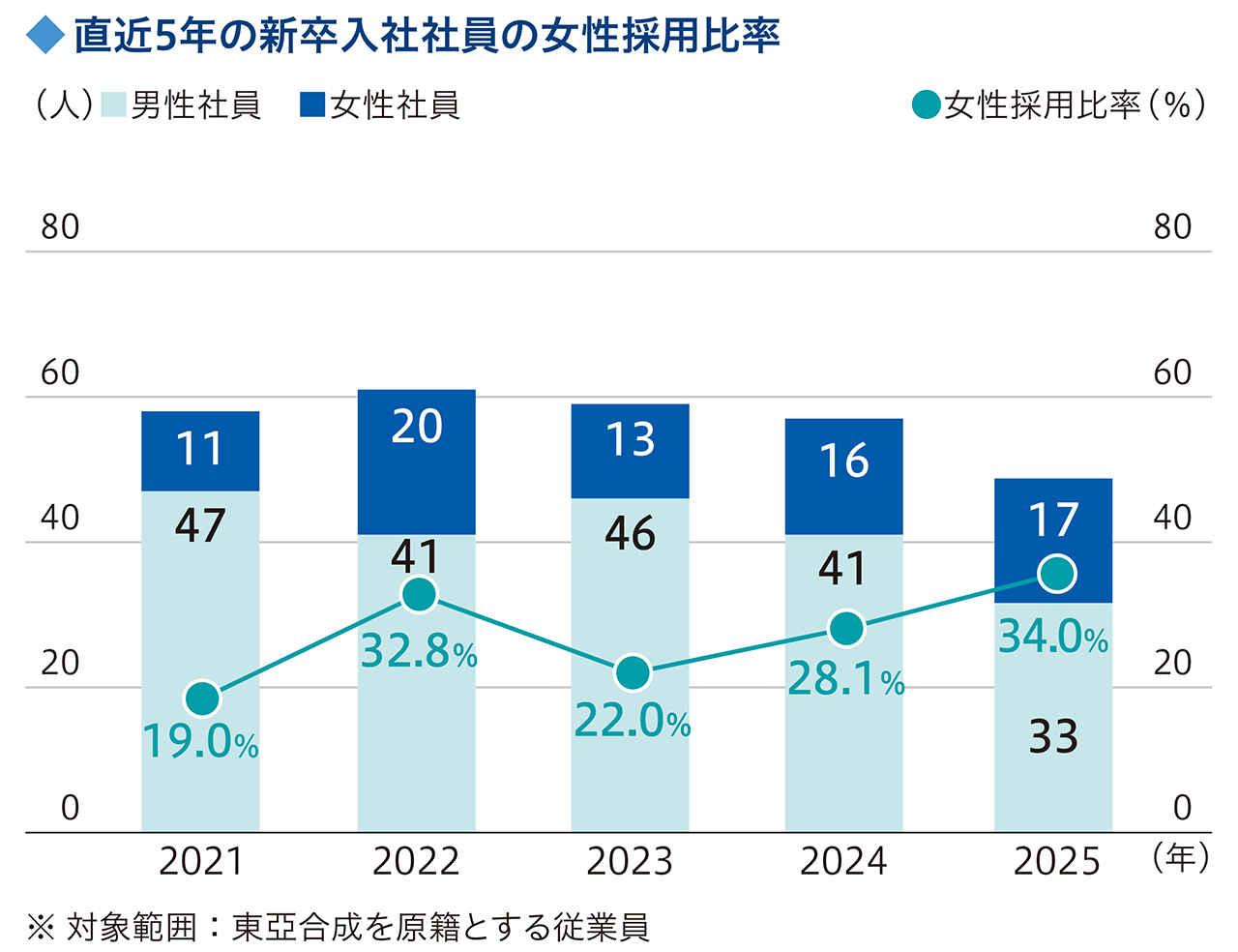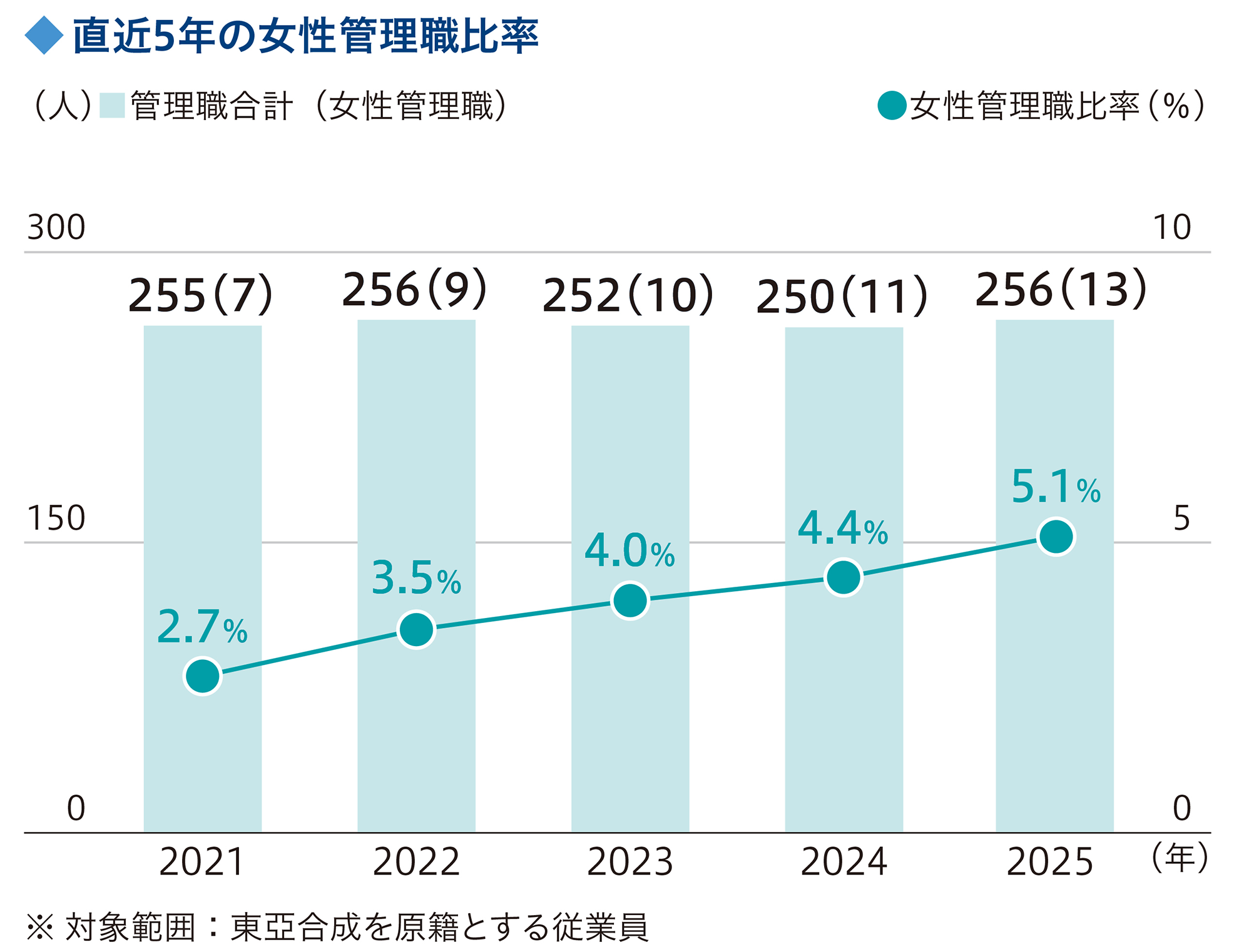 東亞合成グループでは、人権に配慮した公平・公正な処遇を行うとともに、多様な従業員が活躍できる環境づくりに努めています。