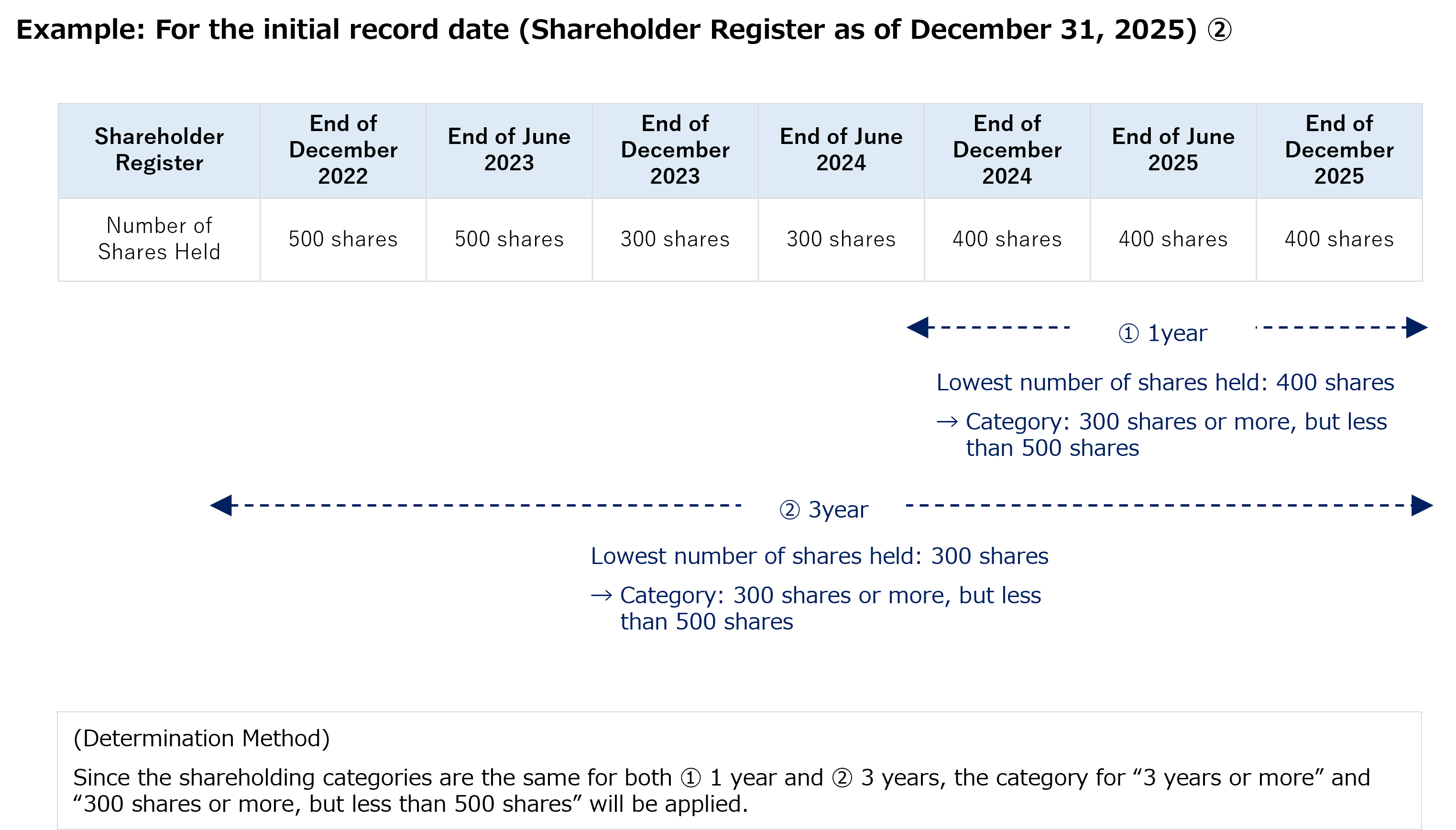 *2 In the event that a shareholder acquires additional shares or sells shares during the continuous holding period, and as a result, the category of the number of shares held as of the last day of June and that of the number of shares held as of the last day of December differ, the category corresponding to the smallest number of shares held by the shareholder during the period shall apply. In addition, if the category of the number of shares held applicable to shares with a continuous holding period of 1 year or more but less than 3 years and that of the number of shares held applicable to shares with a continuous holding period of 3 years or more differ , the continuous holding period shall be regarded as 1 year or more but less than 3 years.