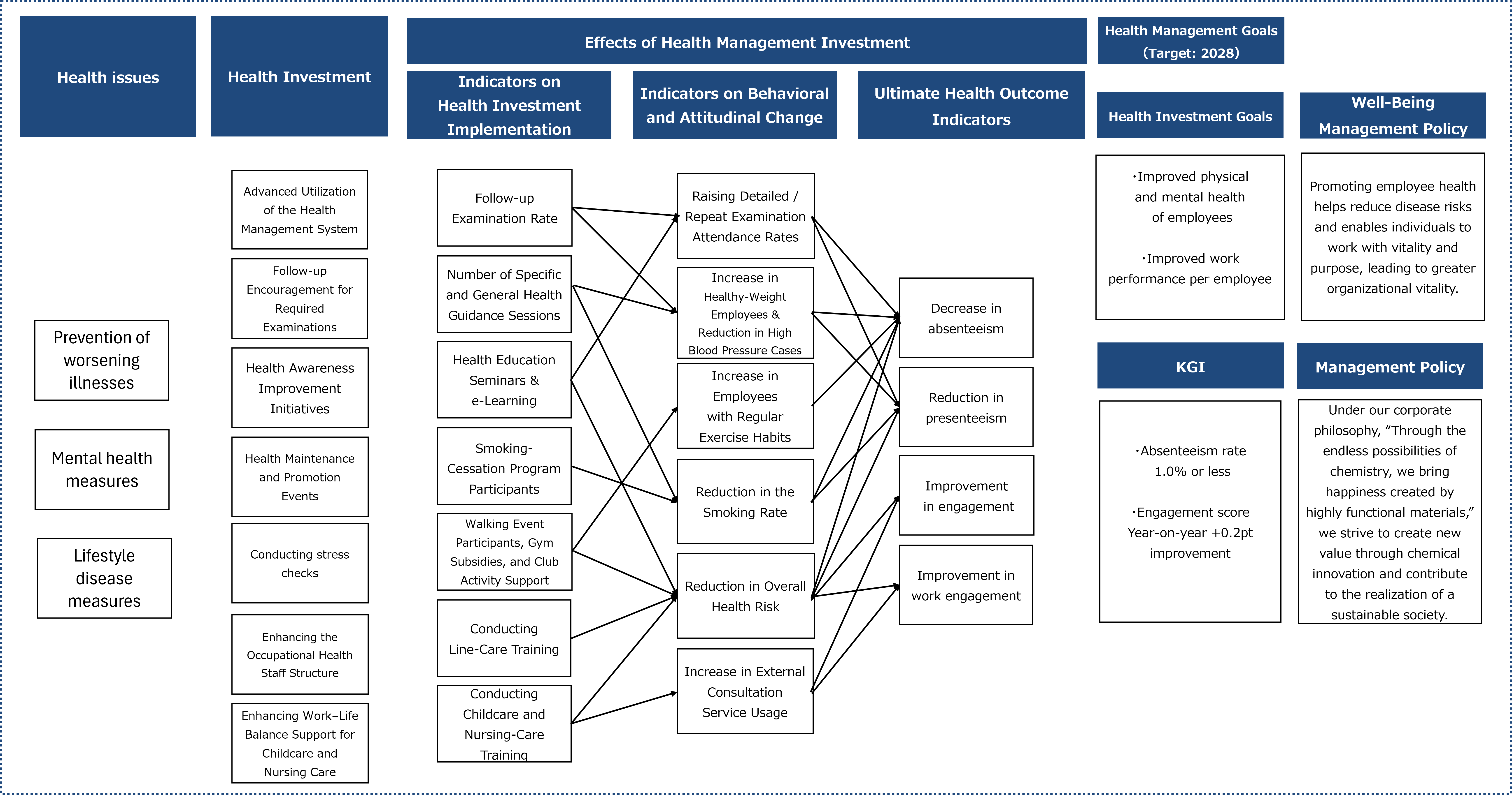 - We advance our health investments by clearly defining indicators for implementation status, indicators that measure changes in employee awareness and behavior, and final outcome indicators. By analyzing the relationships among these metrics, we ensure that our initiatives are carried out effectively.
