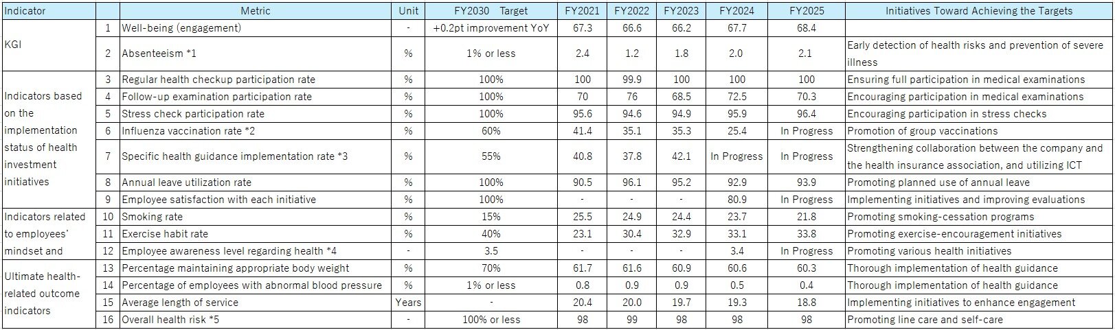 We implement a variety of initiatives—centered on the prevention of lifestyle‑related diseases—to help employees reduce health risks and work with vitality and well‑being. We also establish KGI and KPI to evaluate progress toward our goals.*