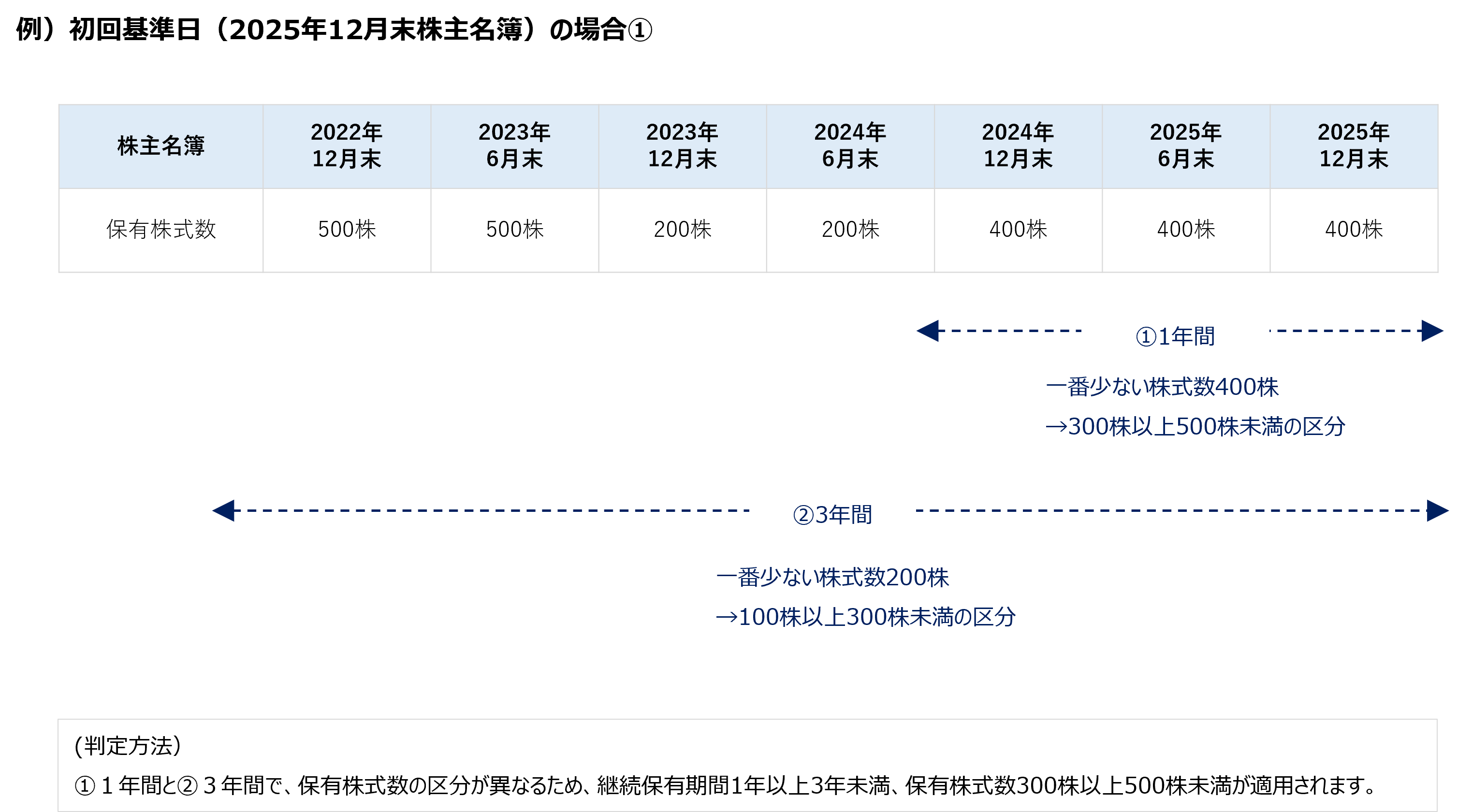 ※2.継続保有期間中に株式を追加取得もしくは売却したことにより、6月末日および12月末日時点の保有株式数の区分が異なることになった場合、一番少なかった保有株式数の区分を適用いたします。また、適用される保有株式数の区分が継続保有期間1年以上3年未満と3年以上で異なる場合は、継続保有期間1年以上3年未満といたします。