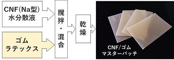 - CNF水分散液とゴムラテックスを混合・乾燥して作ります(図1)。