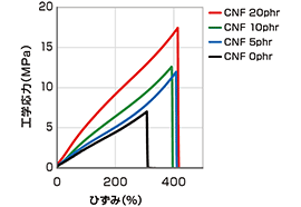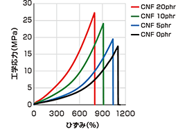 CNFにあるカルボキシ基はナトリウム塩型(-COONa)です。 - ゴム中でよく分散するため、ゴム特有の逆S字型の応力-ひずみ曲線を維持してのヤング率アップが可能です(図2-1、2-2)。